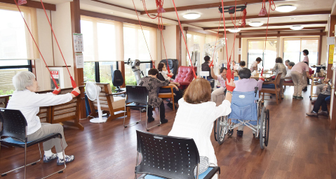 ご利用者様の介護予防・自立回復・介護軽減を目指して、近年話題のノルウェーのスリング・エクササイズ・セラピーやパワーリハビリを取り入れて介護予防や身体機能の回復を通して、ご利用者様の方々が心身共に健康で豊かな毎日を過ごしていただけることを目指しています。